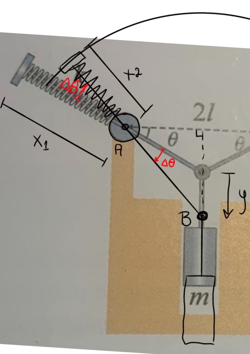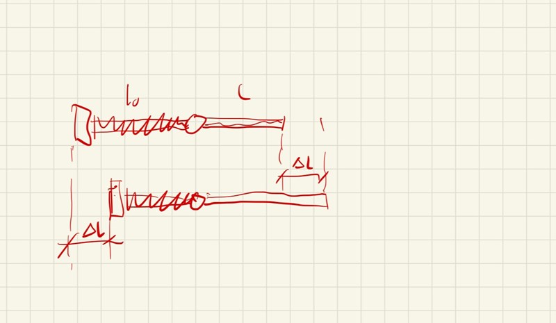 När massan rör sig ned och fjädern roterar runt A kommer fjädern tryckas ihop på grund av att och vi får . Detta är synonymt med att sträckan AB ökar.