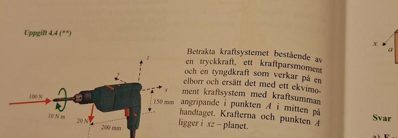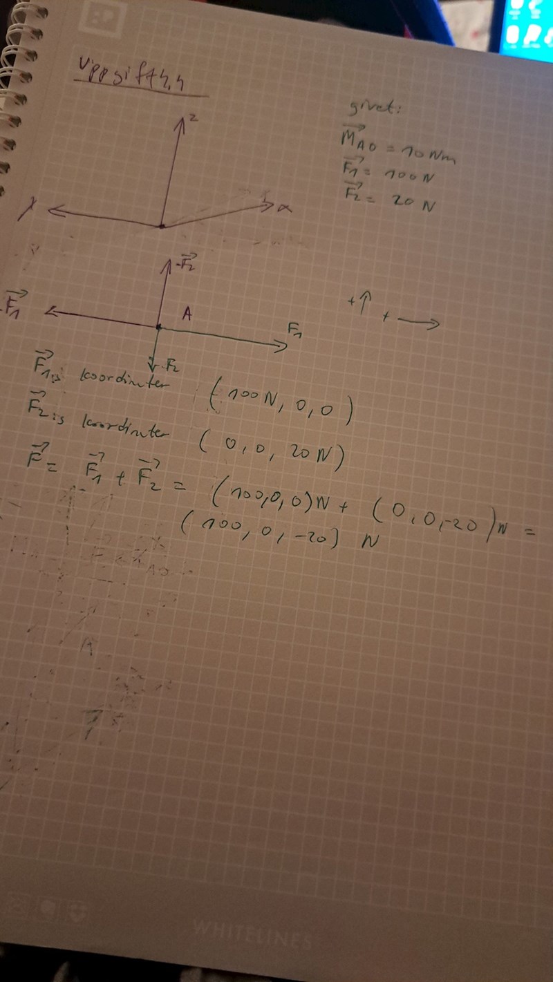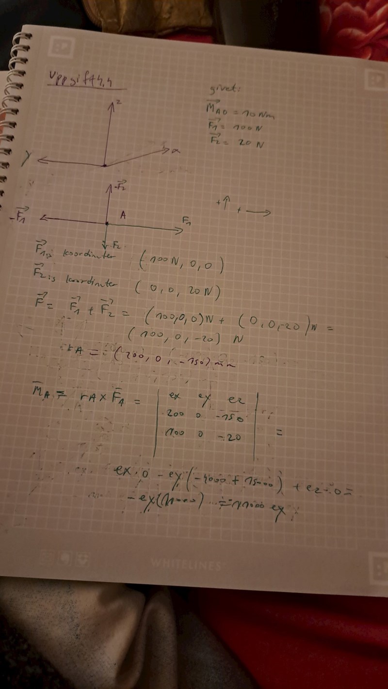 Nu hänger jag tyvärr ej med längre. Vi har 3 kraft som har med moment att göra? Varför räknade jag ens kryssprodukten då? Någon sa till mig att om jag rättar till mitt moment som jag fick mha kryssprodukten så kan jag skriva den på vektorform och sedan addera med givna momentet i uppgiften bara. Ditt sätt verkar vara längre