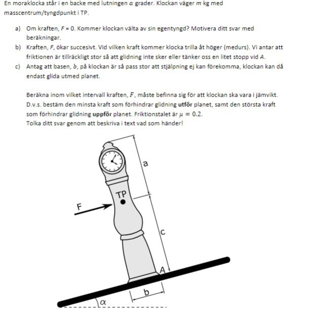 Jag ska räkna ut vid vilken kraft (F) klockan välter och då behöver stjälpande moment > stabiliserande moment.