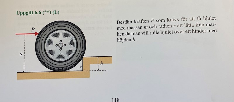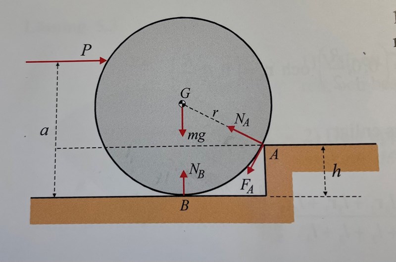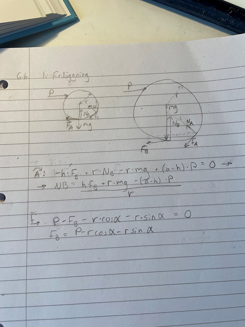 Hej, jag har fastnat på denna uppgift och skulle uppskatta hjälp. Jag ritade först ut alla yttre krafter på systemet (jag bifogar även facitets bild på systemet och dess krafter eftersom min bild är lite otydlig). Därefter använde jag jämviktsekvationerna för att räkna ut momentet kring punkten A. Villkoret för att hjulet ska börja rulla är att normalkraften Nb är noll. Detta medför att jag bara behöver ta reda på Fb i momentekvationen för att kunna få ut P.