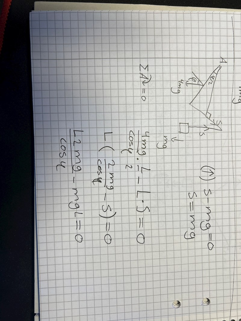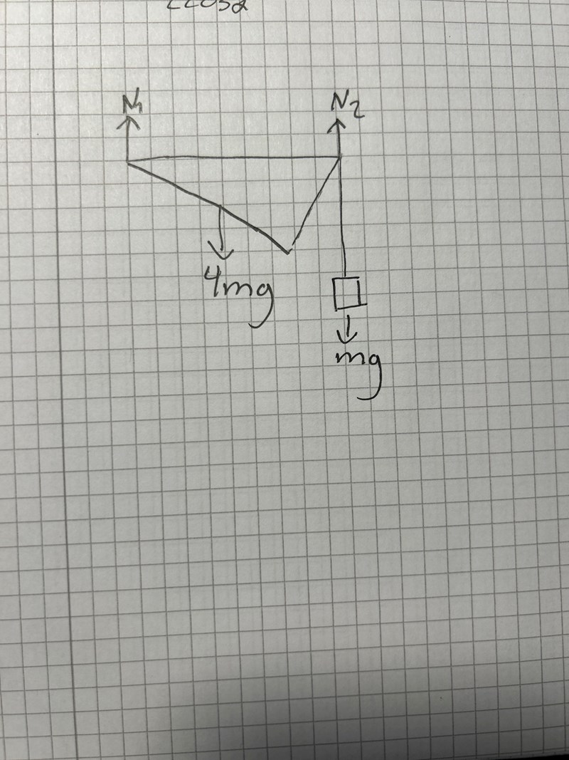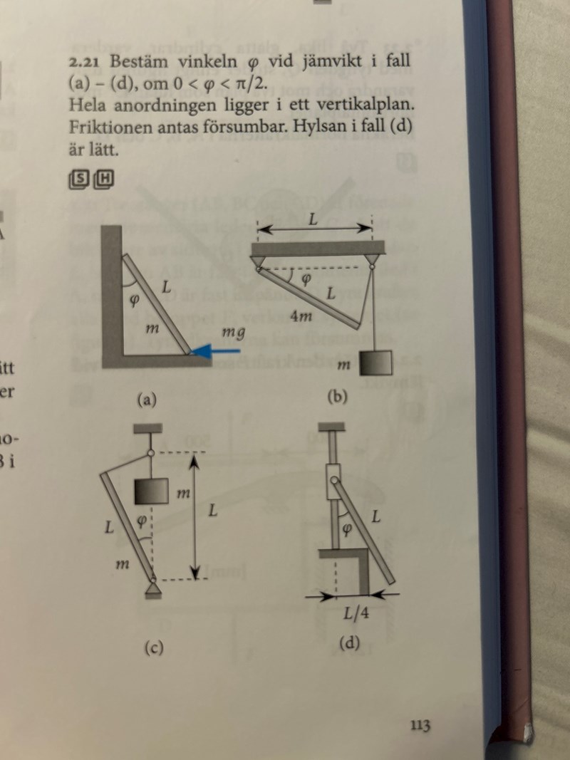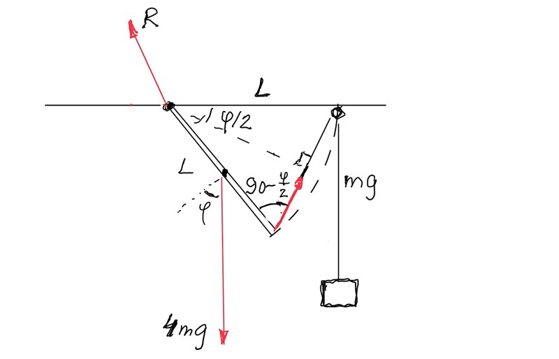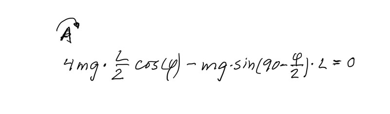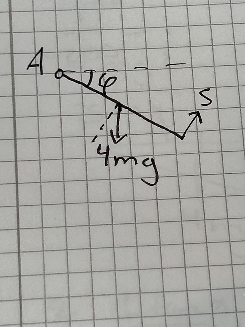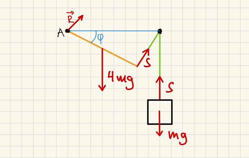 Ytterligare tips. Sätt upp jämvikt för massan m och momentjämvikt kring punkten A för stången med massa 4m.