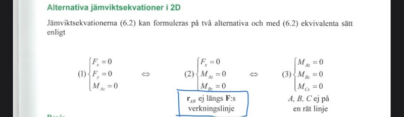 "Här följer ett extra villkor som säger att vektorn ej med kraftsumman . Det är det extra villkoret här, [...]så de här två punkterna* får inte ligga på en linje som är parallell med kraftsumman"