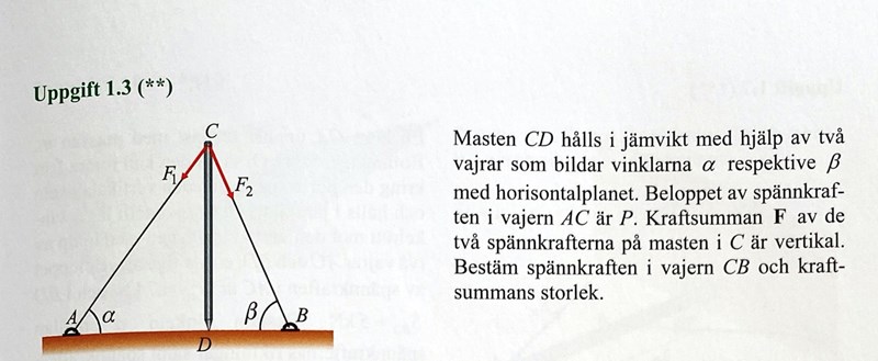 Jag har lite svårt att förstå denna uppgift, vad innebär "kraftsumman F av de två spännkrafterna på masten C är vertikal"?