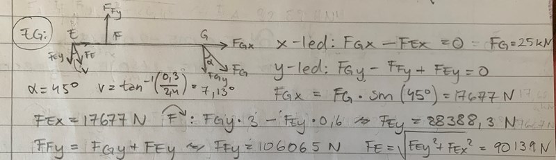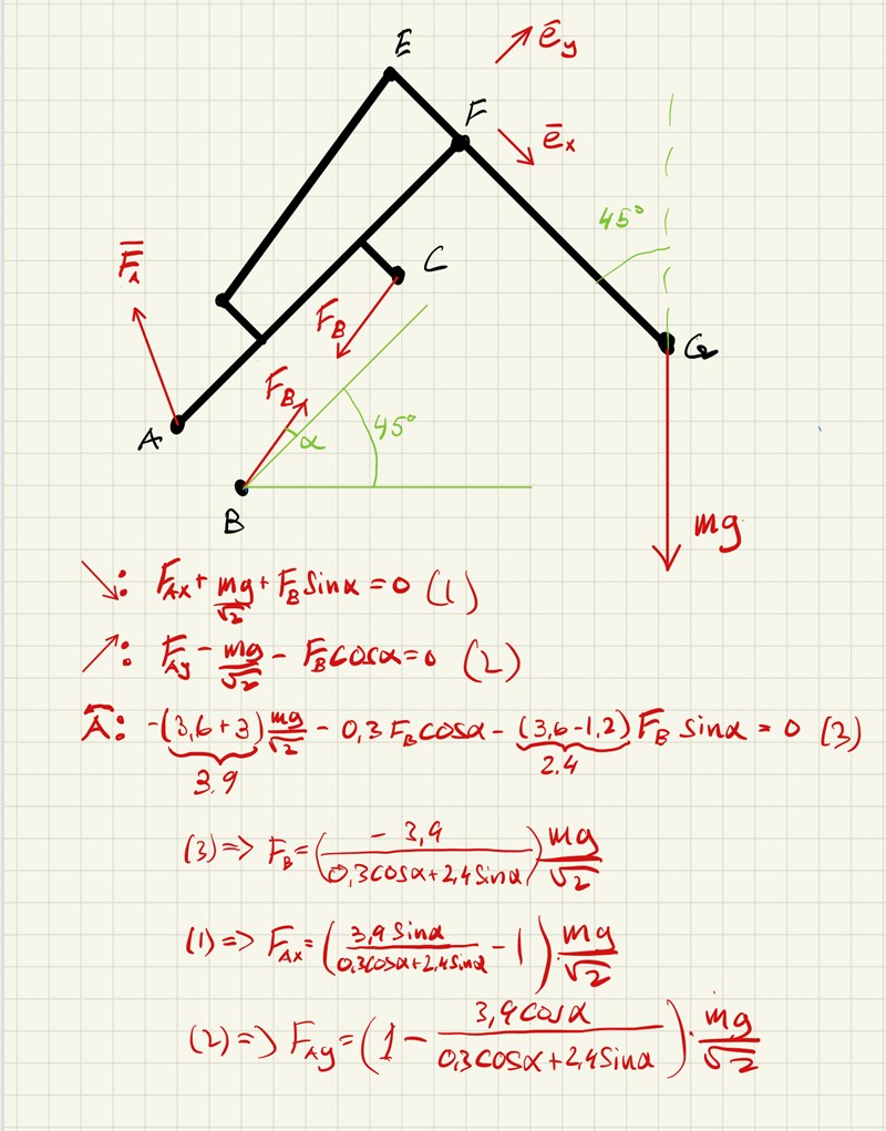 Hejsan! Jag har fastnat på en uppgift i mekanik som handlar om en stockkran. (Se bild nedan). Jag har försökt frilägga de olika delarna, armen E-G och armen A-F. Att frilägga E-G gick bra (tror jag), men jag vet inte riktigt hur jag ska tänka vid friläggningen av A-F och åt vilka håll som krafterna går.