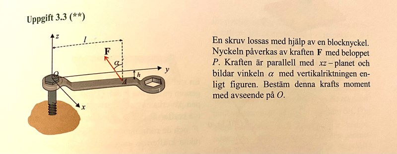 Hej! Behöver hjälp med ovanstående uppgift. Vet att man beräknar kraftmomenten genom att ta vektorprodukten mellan vektorn från O till A och kraften F.