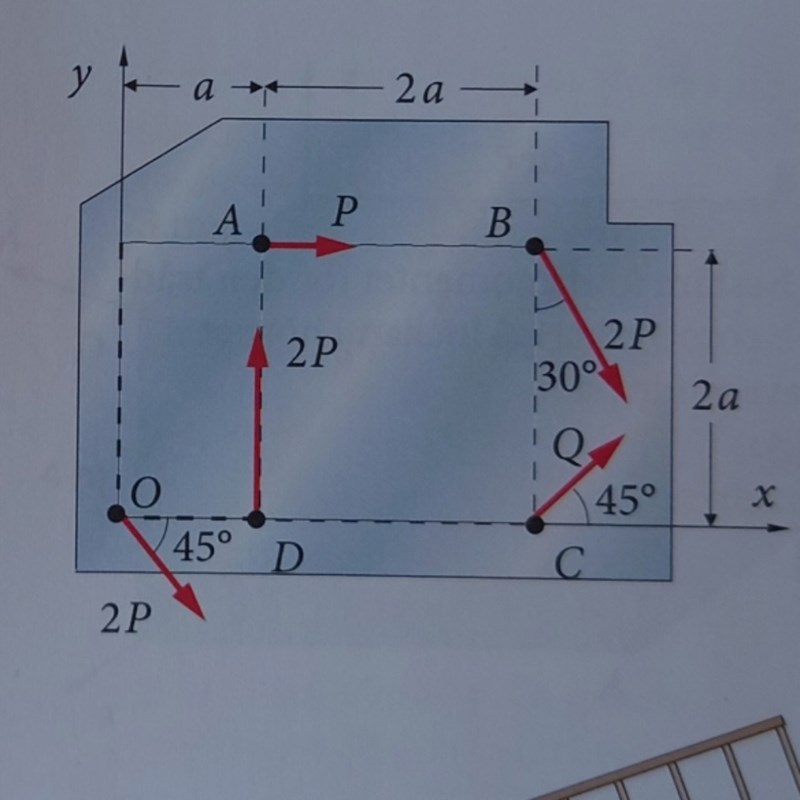2.34 En maskindel påverkas av ett plant kraftsystem bestående av krafterna P, 2P, Q, 2P och 2P med riktningar enligt figuren och angreppspunkter i A, B, C, D, respektive O. Bestäm kraftmomentet med avseende på origo O, om Q = √(2P).