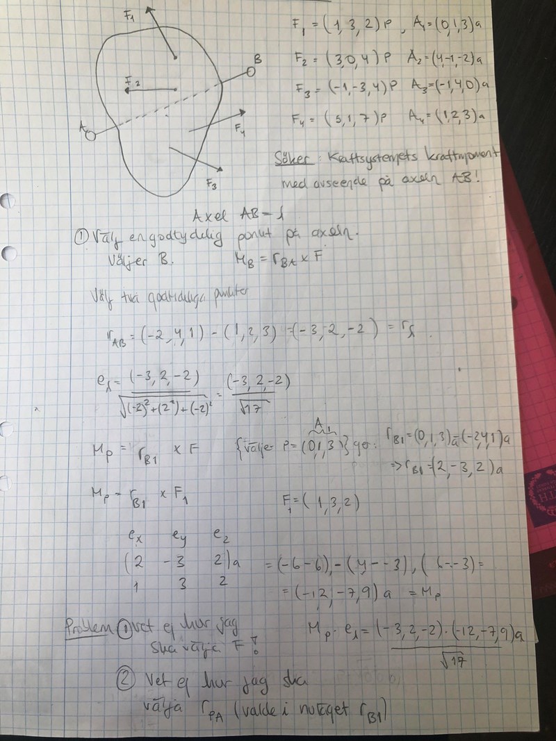 Har en uppgift här som jag kört fast med. Problemet ligger i att jag ej hittar vilken formel jag ska tillämpa för att kunna beräkna momentet med avseende på en godtycklig punkt på axeln (Mp). Vidare vet jag ej om jag kan välja en valfri kraft F av de fyra som finns tillgängliga, eller om jag måste kombinera detta på något vis. Tänkte först sätta P (dvs den godtyckliga punkten) till (0,0,0), då det är lättast, men får ej ihop det. Lyckades iallafall få fram rätt e(lambda) .