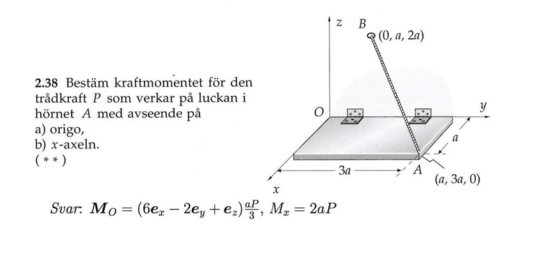 Men det de frågar efter är alltså momentet kring origo för den snörkraft som angriper luckan i A. Det betyder att du behöver använda vektorn som startar i origo och slutar i kraftens angreppspunkt. Punkten A har lägesvektorn