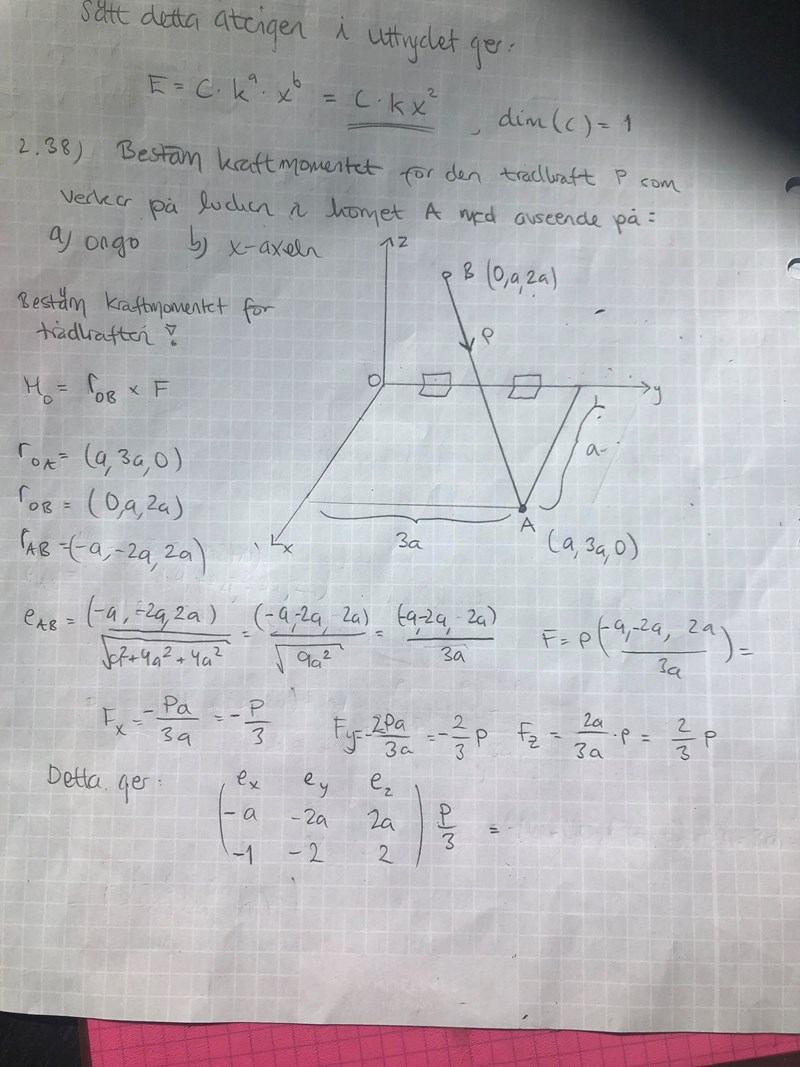Har uppstått ett problem för mig med uppgiften nedan. Hade jag i detta fall fått ett värde för kraften så hade jag somvanligt tagit fram e(AB) och sedan tagit P = P*e(AB), och sedan tagit kryssprodukten mellan angreppspunktens koordinater och P för att få fram momentet.