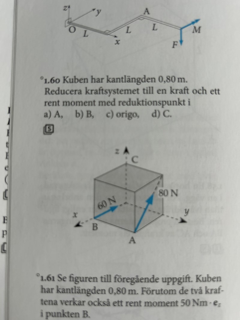 Att reducera ett system ner till kraft och moment kring en given punkt innebär att du summerar alla krafter och moment runt den givna punkten. Notera att kraften är en global egenskap för systemet och kommer inte bero på vilken punkt du väljer. Det kommer oavsett bara bli den totala resulterande kraften . Momentet varierar dock. Där räknar du som vanligt med där är det rätvinkliga avståndet till kraftens verkningslinje, alternativt med vektorer .