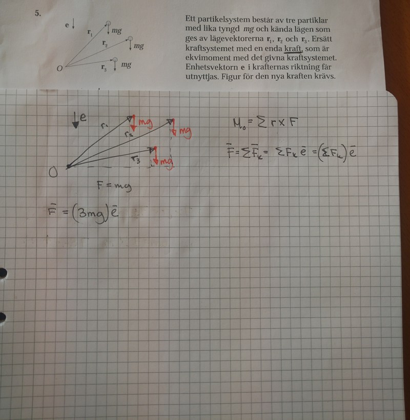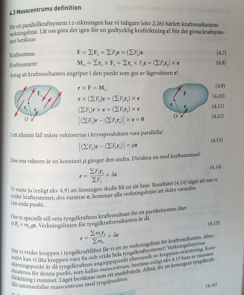 Du kan tex välja = 0 i 4.15 och anse att en kraft motsvarande kraftsumman till kraftsystemet angriper i masscentrum.