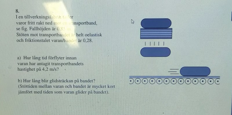 v0 har riktning rakt ner och 4.2m/s på transportsbandets riktning. Det finns ju friktion också så det borde jag väl ta hänsyn till?