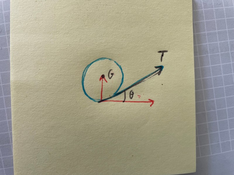 Kraften T tangerar din turkosa cirkel. Det betyder att det vinkelräta avståndet från kraften T till G är 75 mm. Inget cos theta där.