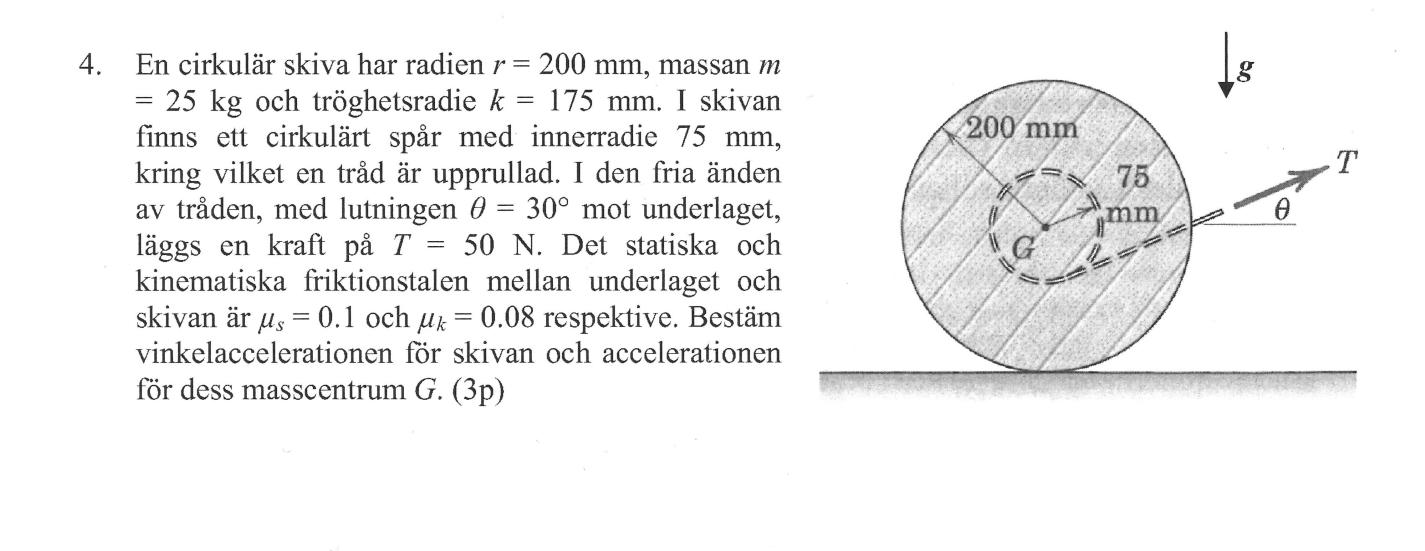 På denna uppgiften förstår jag inte hur de har tänkt med momentet. Jag saknar ett vid det gulmarkerade. Annars vill jag komposantuppdela kraften enligt bifogad skiss och får då att en del går genom masscentrum och därför ej bidrar med något moment.