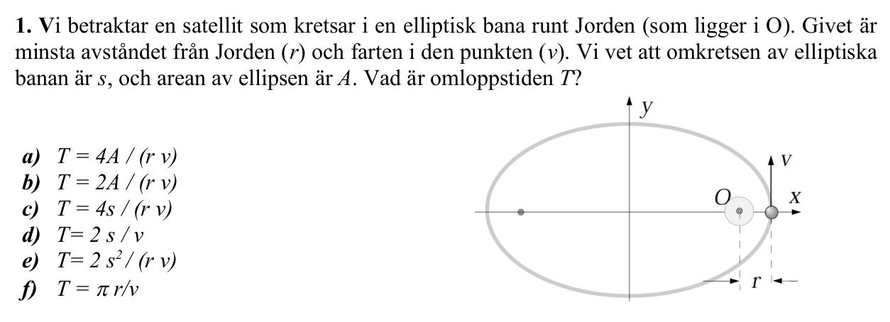 Men här är rätt svar b), där man inte använt (sektor-/areahastigheten) utan istället verkar man ha använt hastigheten vid cirkelrörelse: (ingen kvadrerad term). Annars stämmer formeln.