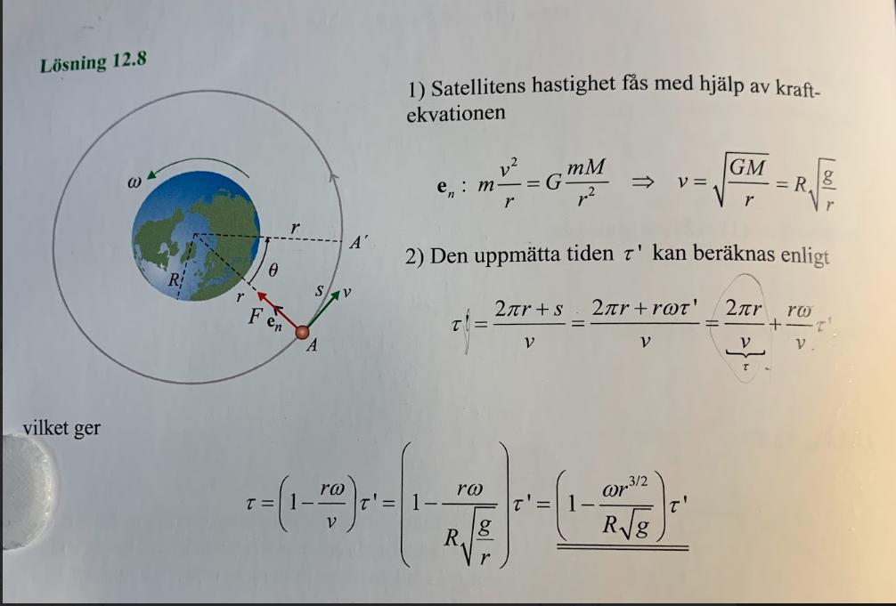 Kalla punkten observatorn ser satelliten i för . För cirkelrörelse gäller . Detta ger oss att i , när satelliten rört sig en liten sträcka har vi Vi har från uppgiften.