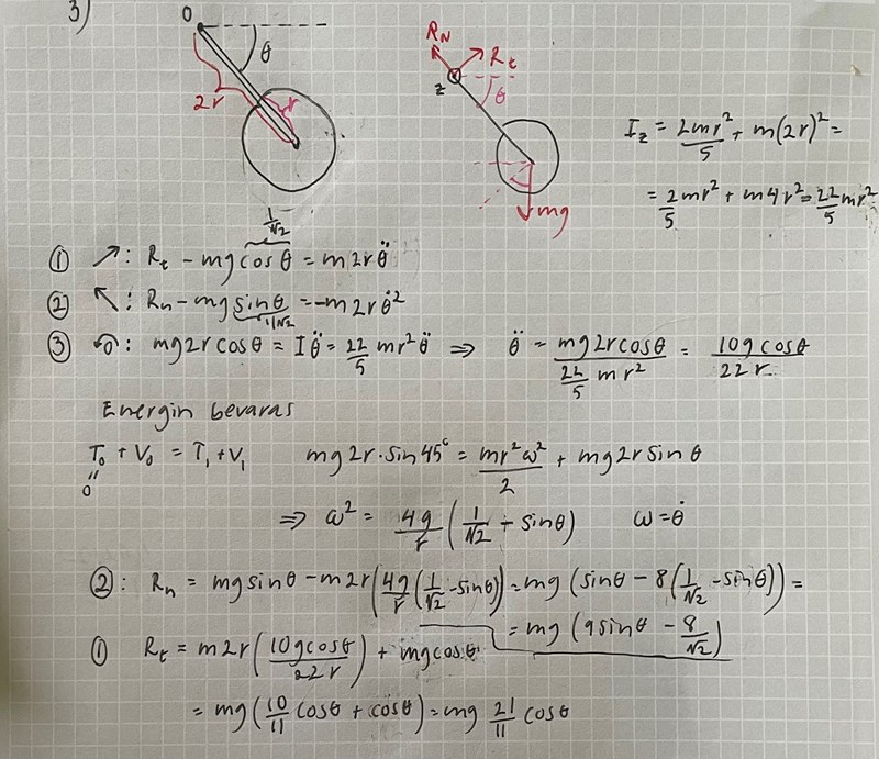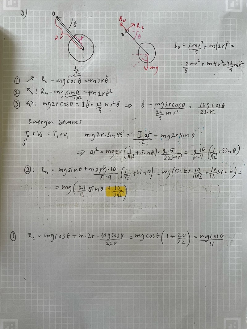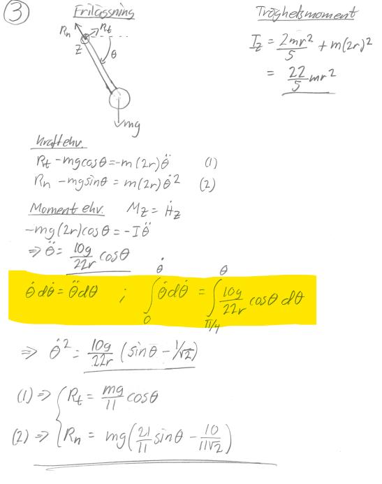 För att beräkna använder lösningsförslaget en trickbetonad lösning som går ut på att integrera över ett vinkelintervall . Om man inte är bekväm med billiga trick kan man istället bestämma genom en enkel energibetraktelse (energin bevaras, vilket ger vinkelhastigheten för alla vinklar).