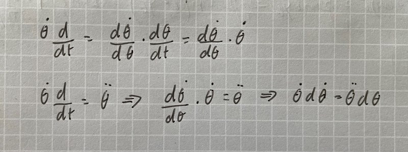 I startögonblicket är vinkelhastigheten 0, dvs Därför börjar integralen som integrerar över vinkelhastigheten på 0. Sedan slutar den vid den godtyckliga hastigheten som är vinkelhastigheten vid den godtyckliga slutvinkeln . Det är just detta vi behöver sätta in i kraftekvationen. Är du med?