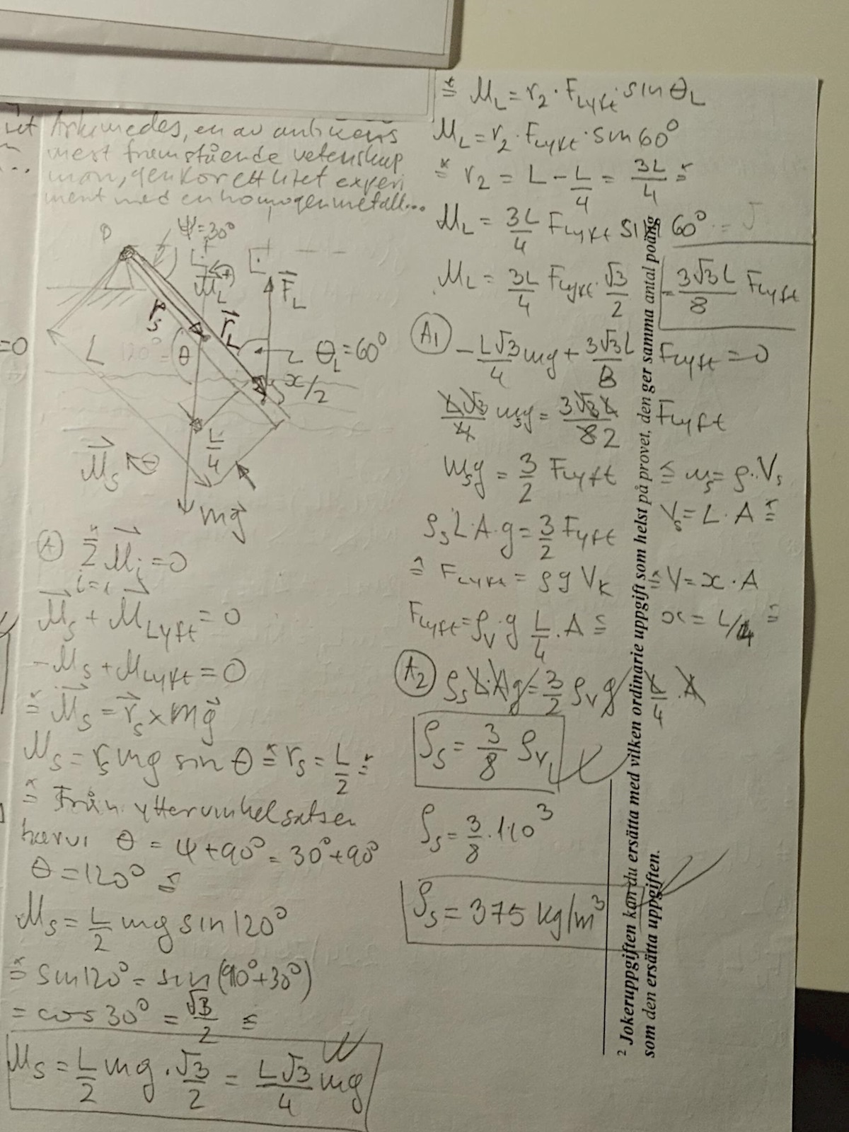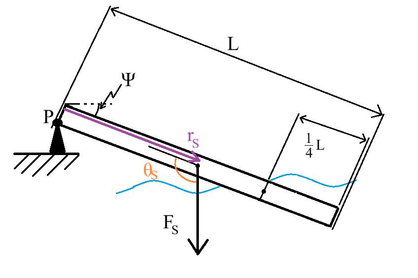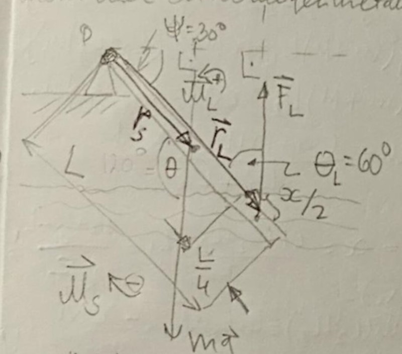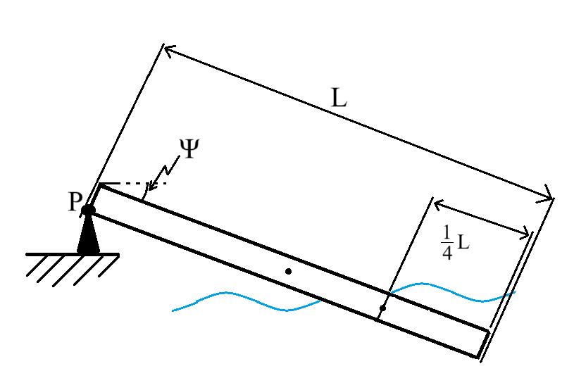 En homogen metallstav är fäst till en punkt P och lutar ned med vinkeln på trettio grader. En fjärdedel av staven längst ut befinner sig under ytan av en vattenmassa vilket är orsaken till att staven är stillastående. Bestäm densiteten av staven ifall vattnets densitet är .