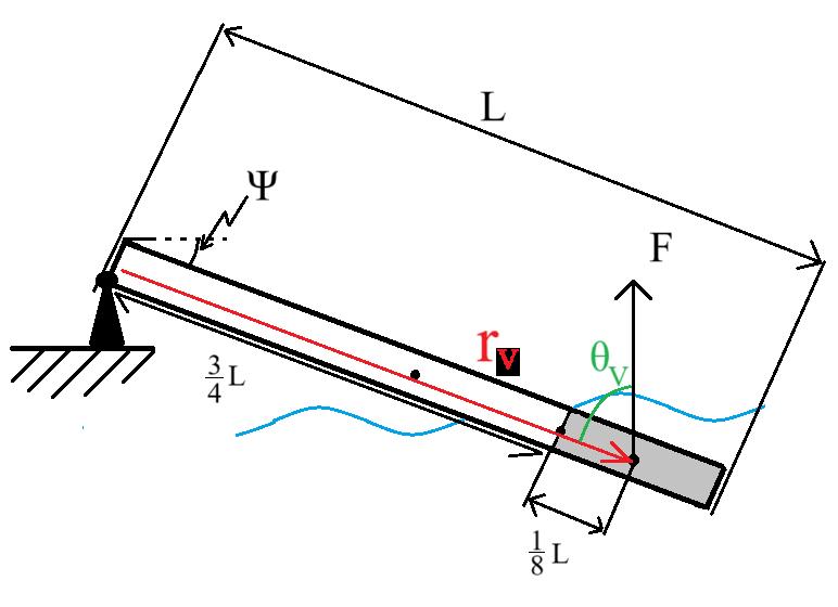 Men jag känner att detta inte hjälper att förklara varför lyftkraftens avstånd är bestämt tre fjärdedelar trots att den nedsjunkna volymen kan i teorin vara tre mil lång medans resten av staven är bara någon meter i längd. Det känns för osammanhängande för mig. Jag är väldigt tacksam för någon förklaring gällande hur man ska tänka med vridmoment och lyftkrafter, specifikt i denna uppgift.