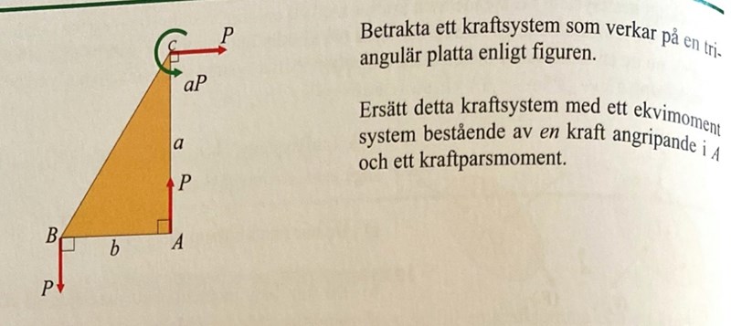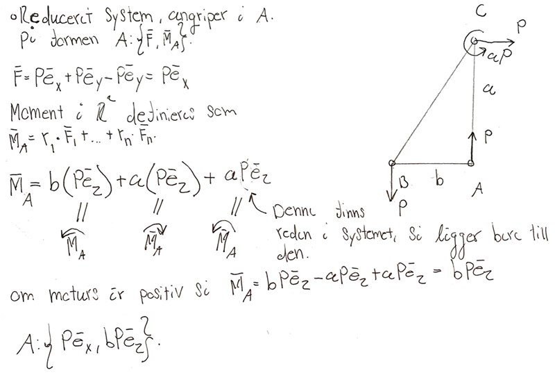 Jag är lite osäker om denna metod är korrekt så jag vill dubbelkolla. Jag vet att man kan reducera ett kraftsystem till en kraft och ett moment. Jag förstår kraftsumman, det är ganska simpelt men det är momentet som jag främst är osäker om.