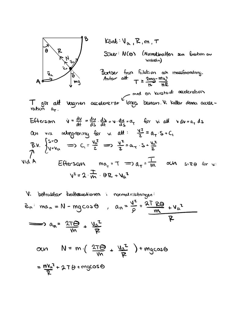Jag tror jag måste ha gjort något fel i min analys av de krafter som verkar. Uppenbarligen får jag de första två termerna rätt, men med den sista blir det fel. Någon som ser vart jag gör fel? har också lite svårt att se på vilket sätt antagandet om T kommer in, så om någon kan hjälpa med det hade jag också varit tacksam!