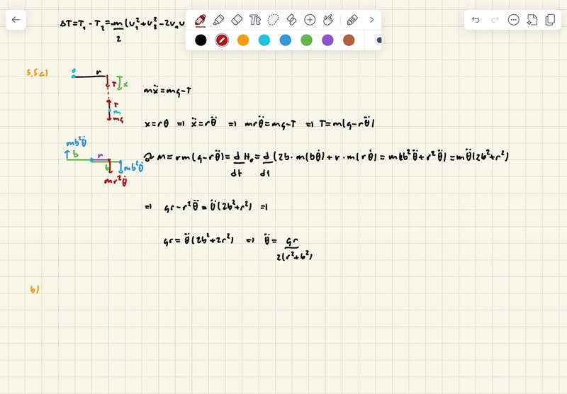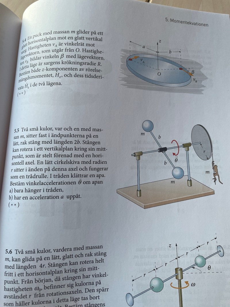 På 5,5 hänger jag med på a), men på b) när apan klättrar uppåt blir det svårare. I a) tas apans rörelsemoment med då det totala rörelsemängdsmomentet beräknas. Men varför? Ska man inte bara ta med bidrag som är cirkulära rörelser? I a) faller ju apan rakt nedåt och i b) blir det ännu svårare.