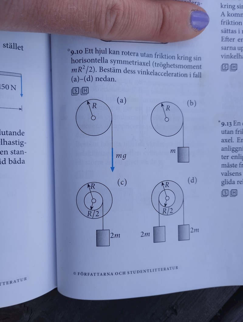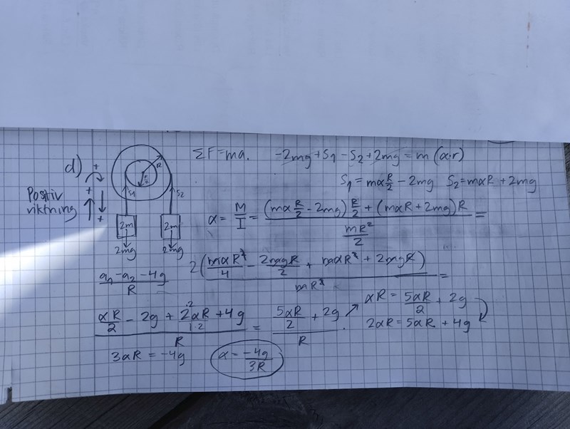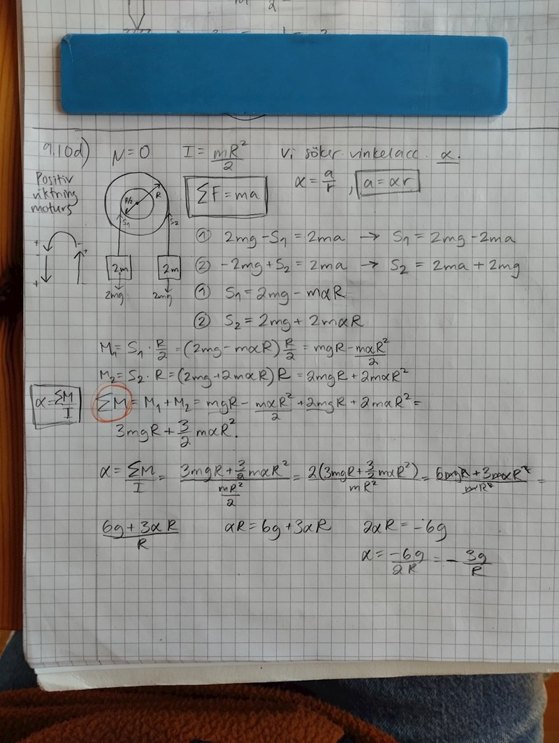Hej! Jag skulle behöva hjälp med nedanstående uppgift 9.10 D (a, b och c har jag klarat av redan) där vinkelaccelerationen ska bestämmas. Har försökt 2-3 gånger och kommit fram till nedanstående svar som är nääästan rätt men inte helt rätt. Kan någon hjälpa mig att se vart jag har tänkt fel? Utnyttjar alltså formlerna , och där a här står för tangentiell acceleration, M moment, I tröghetsmoment.