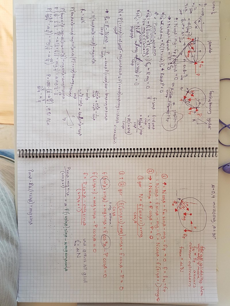 Tack! Nu är de löst. Genom att räkna ut momentet på två ställen och bryta ut friktionskraften på båda och använda dessa ekvationer för att få reda på normalkraften mot lutningen uttryckt i P och mg sen sätta in de jämviktsekvationerna för att få ut f och sen ta f=uP 😊