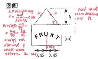 Det är vertikalt som varje lina behöver klara 19,65 N. Den totala spännkraften i båda linorna kommer totalt att bli större än mg, förstår du varför? Vad händer med krafterna i x-led?