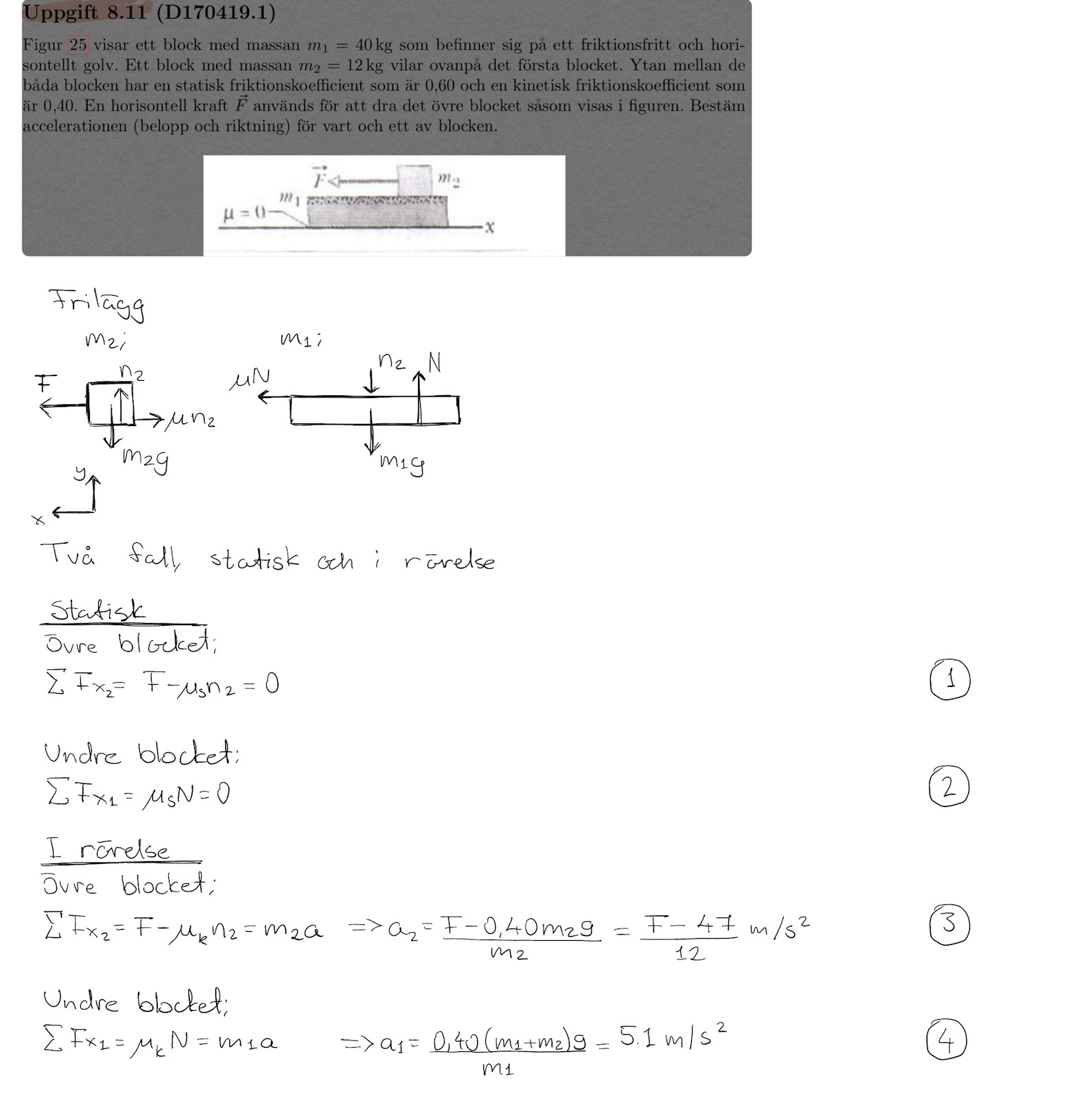 Pieter Kuiper skrev:Cien skrev:Jag undrar vad acceleration är för det undre blocket när . Jag får det till 5.1m/s2 som är fel.