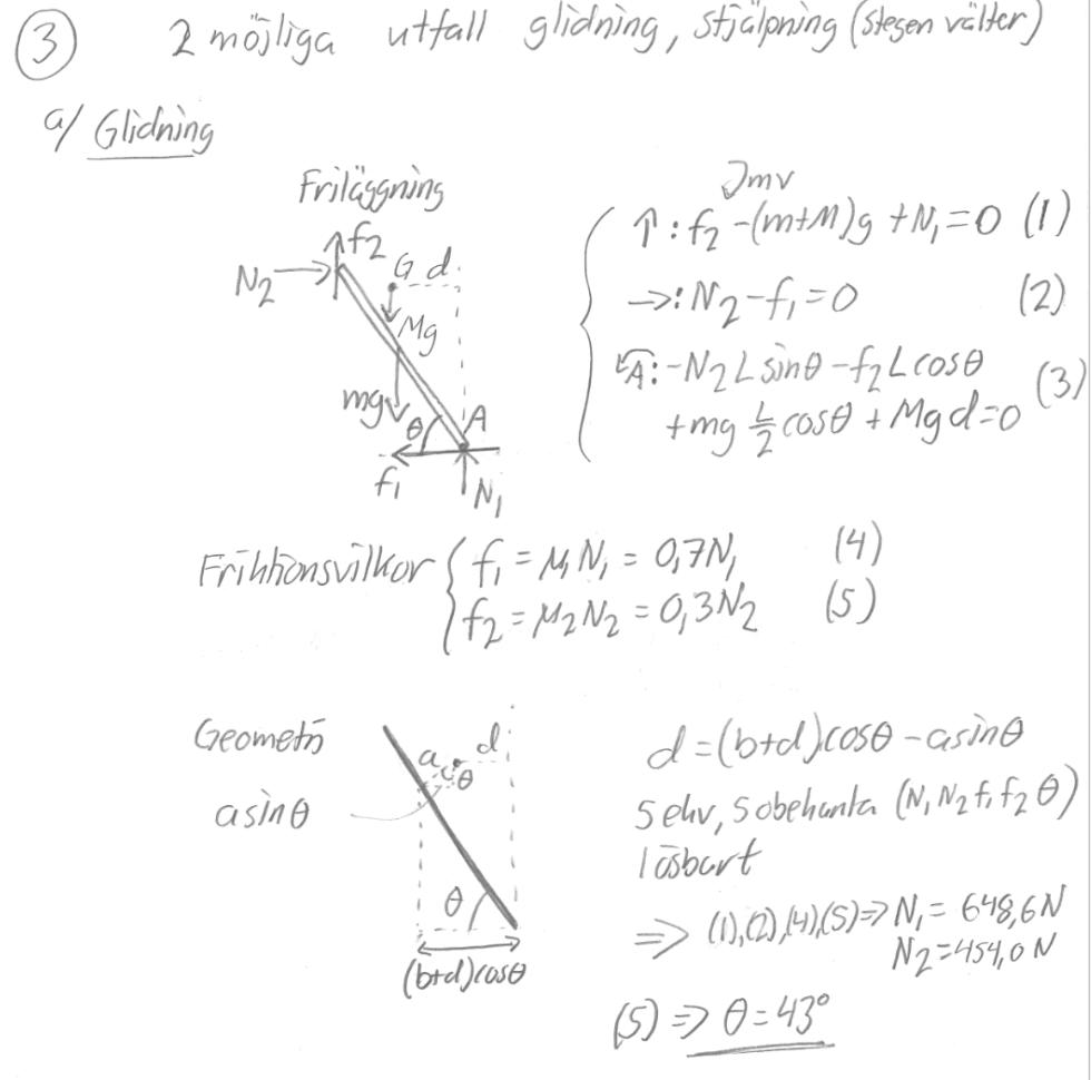 Hej! Varför blir det d och ej (b+d)cos i momentet kring A? Alltså ekvation 3 där det står Mgd. Jag hänger ej med på figuren där det står geometri. Hur blir det d där de skrivit d i figuren?
