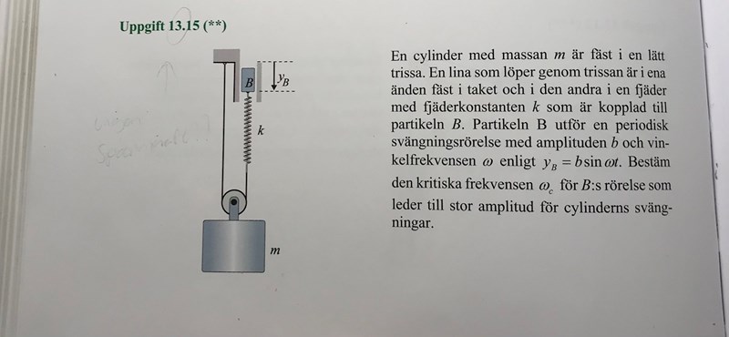 Svaret är 2sqrt(k/m). Jag vet inte riktigt hur jag ska angripa problemet, finns det tex någon spännkraft som jag måste ta hänsyn till?