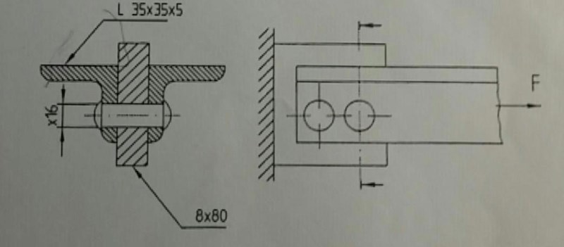 Det är en vanlig ritteknisk projektion och föreställer två L-balkar, fastsatta med två nitar i en rektangulär konsol, som i sin tur är fäst i väggen. I vänstra bilden ser man snittet, som är markerat med två pilar i den högra bilden, och högra bilden är helt enkelt konstruktionen sedd från sidan, fast konturen vid F indikerar att balkarna är längre än på bilden.