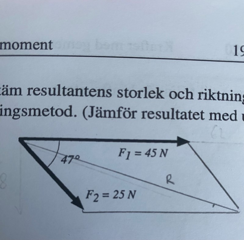 Man ska bestämma resultantens storlek och riktning med hjälp av (analytisk metod. )