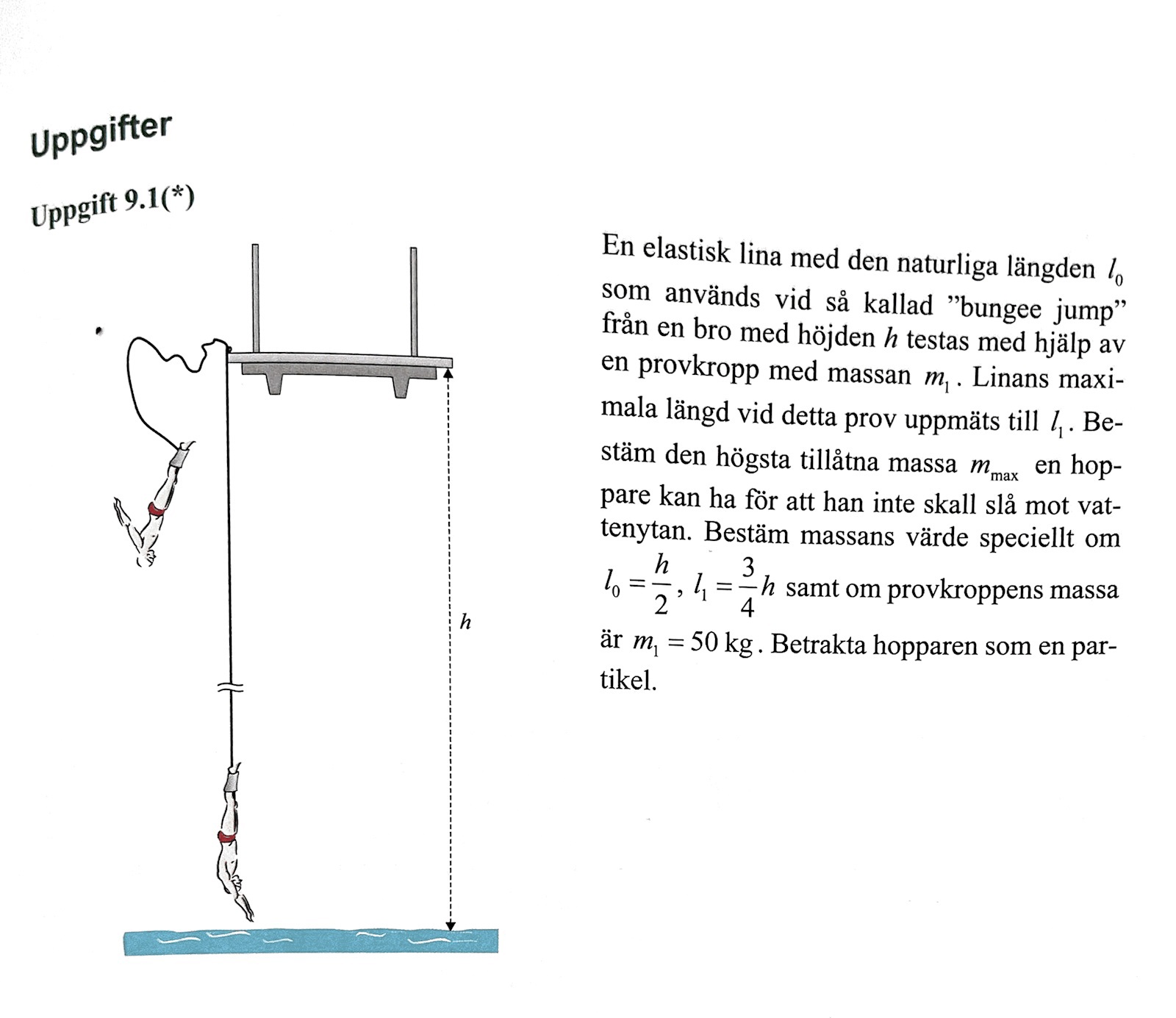 Jag förstår inte hur man ens ska tänka här. Den finns flera ekvationer som jag kan tänkas användas, som U1-2=V1-V2eller kanske mekaniska energilagen T1+V1=T2+V2 där då U är arbetet, V är potentiella energin och T är kinetiska energin. Sedan antar jag att potentiella uppkommer från tyngdkraften V=mghoch kanske fjäderkraften V =12k(L)2.