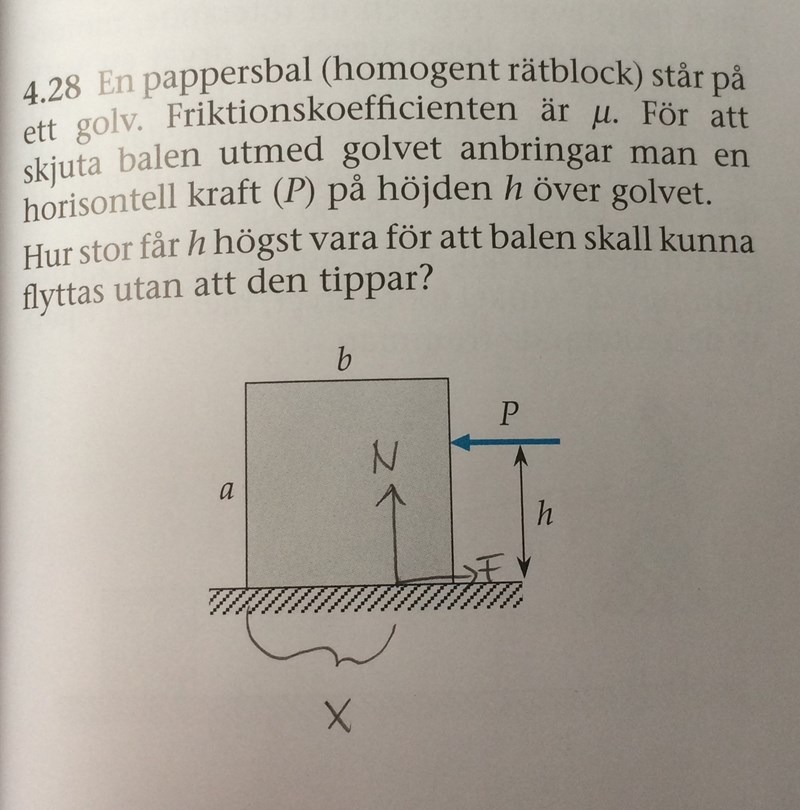 När pappersbalen precis börjar tippa kommer den rotera runt x=0, det innebär att endast vänstra hörnet har kontakt med markytan och normalkraften i hörnet balanserar hela vikten. Det andra hörnet av balen lättar och där måste kontaktkraften mellan markytan och balen gå mot 0.