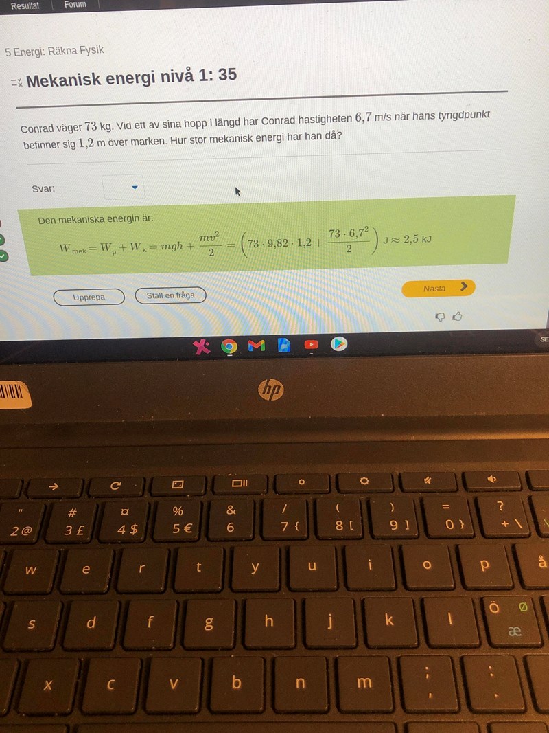 Jag skrev att mekaniska energin där uppe är kinetiska energin + potentiella energin (läge (2))