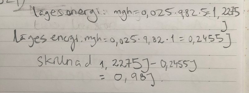 Smaragdalena skrev:Om det är en helt elastisk studs så är det inga förluster, och bollen studsar upp till samma höjd som den släpptes från. Så är det alltså inte i det här fallet. Hur stor var bollens lägesenergi när bollen släpptes? Hur stor är bollens lägesenergi när den vänder 1 m över golvet?
