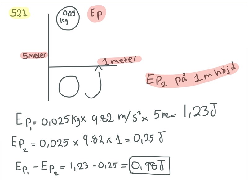 En bandboll som väger 25 g släpps från 5 meters höjd, den studsar upp till 1 meters höjd,hur mycket mekanisk energi har förlorats?