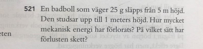 Smaragdalena skrev:Varje gång bollen studsar, förlirar den en del av sin mekaniska energi, som blir till andra energiformer, som ljud och värme. Det innebär att bollens hastighet uppåt efter studsen är lite mindre än hastigheten neråt alldeles innan studsen.