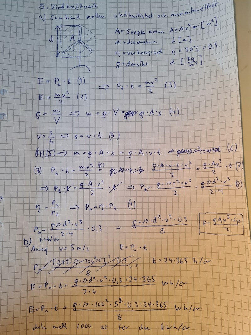 1) Ställ upp ett generellt samband mellan vindhastighet och momentaneffekt.