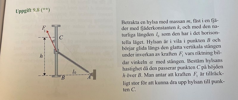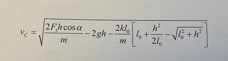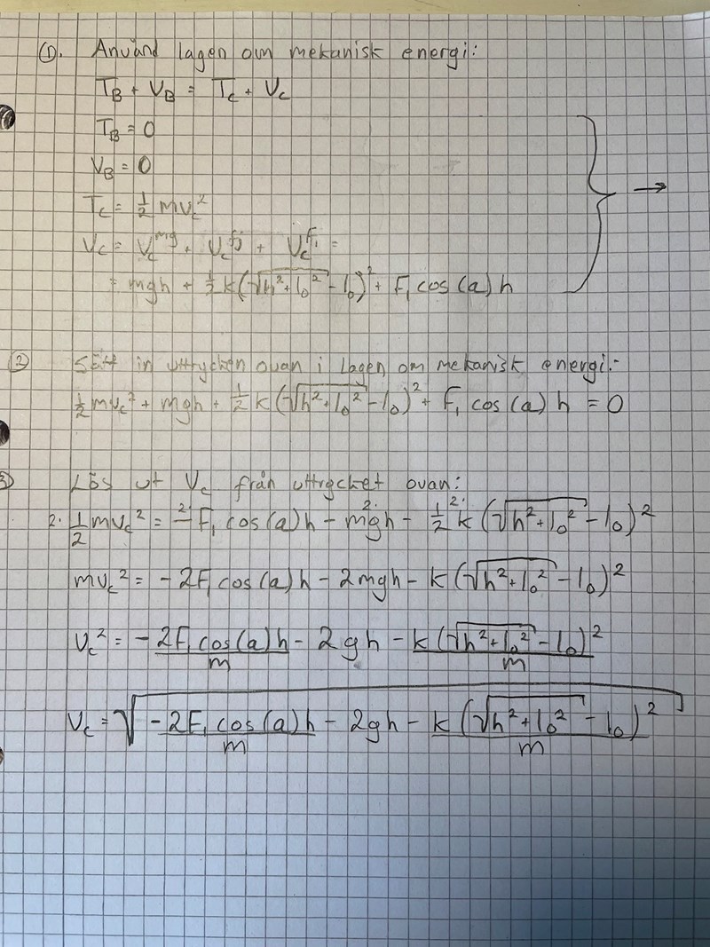 Hej, jag har försökt lösa denna uppgift men får fel uttryck för hastigheten vid punkten C, dvs Vc. Vad är det jag gör för fel?