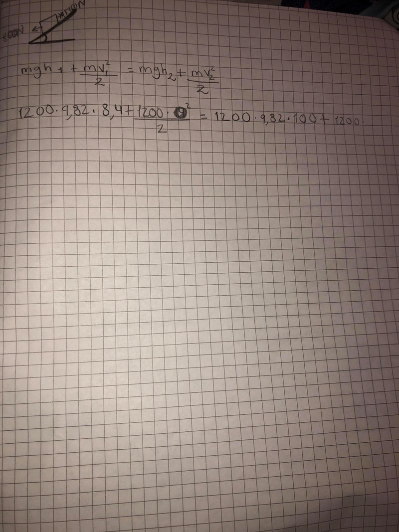 "En bil med massan 1200 kg kör uppför en rak backe som är 100 m lång. Då kommer bilen 8,4 m högre upp i terrängen. Förutom tyngden är det två krafter som utför arbete på bilen: en dragkraft framåt på 1500 N och friktionskrafter bakåt på 800 N. Längst ner i backen är hastigheten 14 m/s."