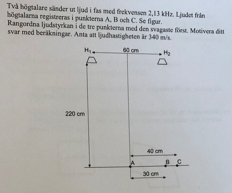 Alternativ metod: Om du inte är med på hur formeln fungerar så är det egentligen lämpligare att studera vägskillnaden direkt. Principen för intererens är ju att om skillnaden i sträckor mellan punkten och högtalarna
