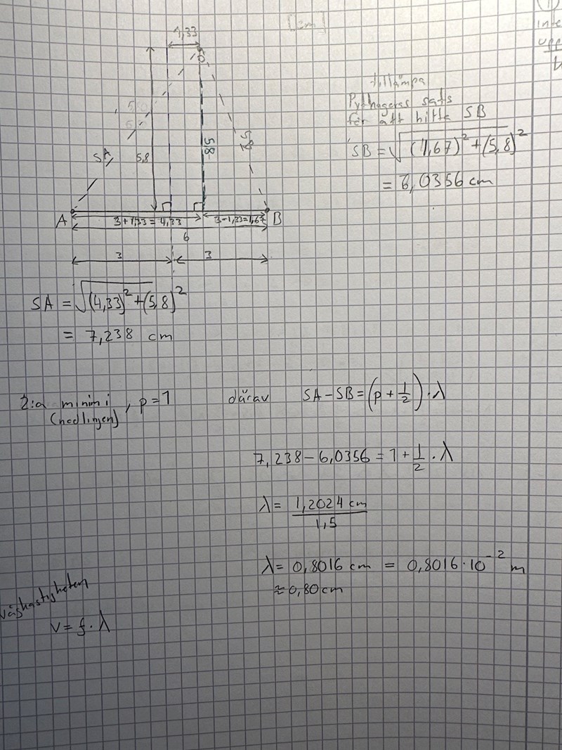 ska man först dela in vardera sida som rätvnikliga trianglar för att ta reda på PS1 och PS2, sedan ta hjälp av pythagoras sats. sedan tolka punkten P som en destruktiv interferens p=2 där ΔS=(p+(1/2)) x λ ? man löser ut λ