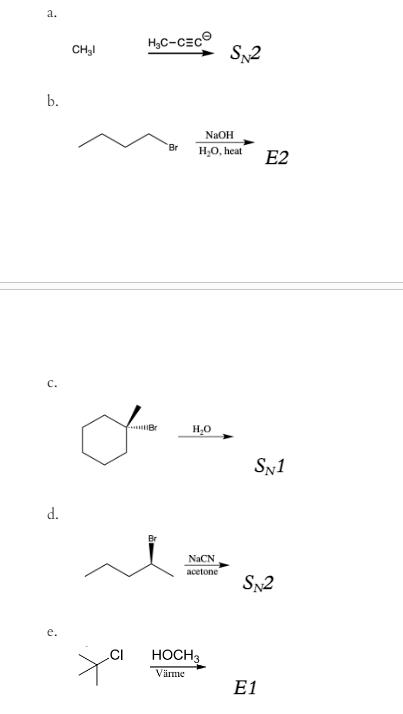 2) Även här förstår jag att det står mellan SN2 och E2 av samma ovan anledning. Vi har en stark nukleofil (OH-) dock i polärt lösningsmedel vet inte hur det påverkar men de andra alternativen SN1 och E1 är borta så då spelar det väl ingen roll. Sedan tillsätts det värme vilket talar för E2, men är det den enda anledningen?