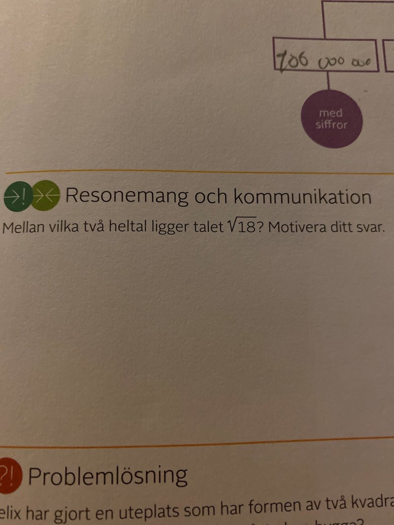 Eftersom 18 ligger mellan dessa kvadrattal måste roten ur 18 vara mellan___?