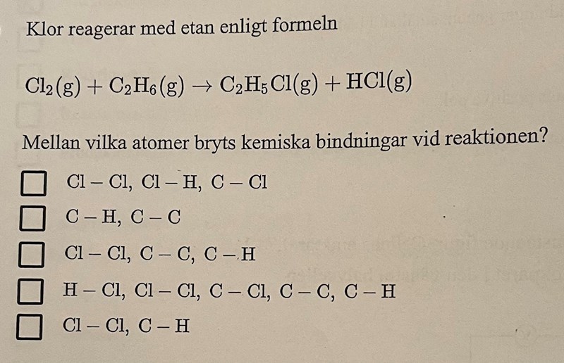 Jag förstår inte alls vad jag ska göra eller hur jag ska gå till väga. Jag förstår heller inte vad reaktionsformeln med klor och etan ska kunna hjälpa mig lösa uppgiften. Vad är det för kunskaper man behöver ha för att kunna lösa denna uppgift?