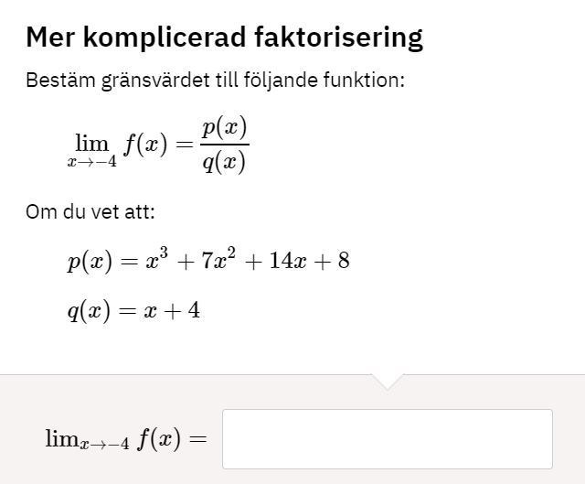 Om jag förstått det rätt så kan man antingen använda sig av polynomdivision eller någon annan metod som jag inte begriper mig på. Polynomdivision tänkte jag spara tills jag kommer in på matte 4 eftersom jag vill kunna lösa denna uppgift på något sätt med de verktyg jag hittills gått igenom.